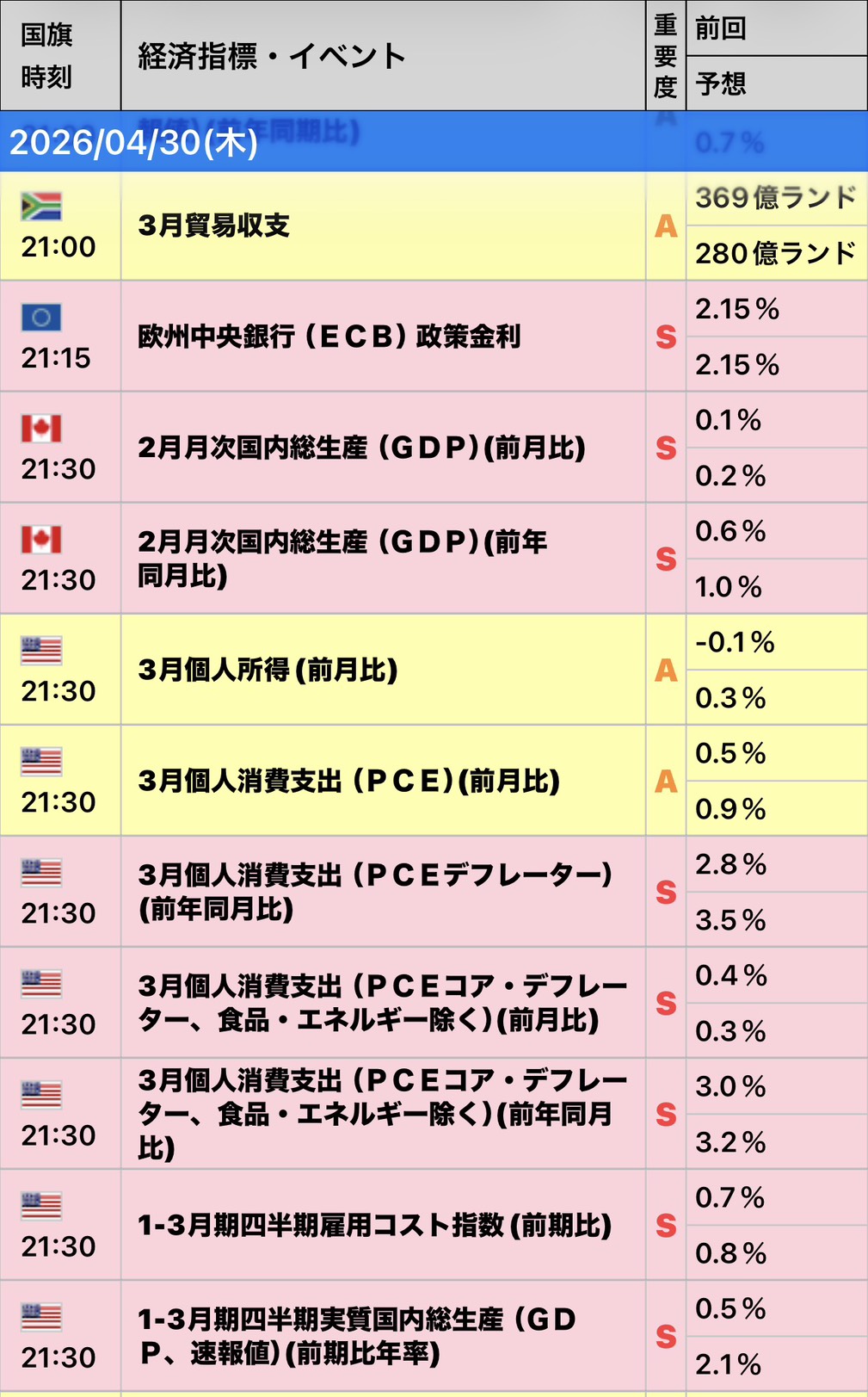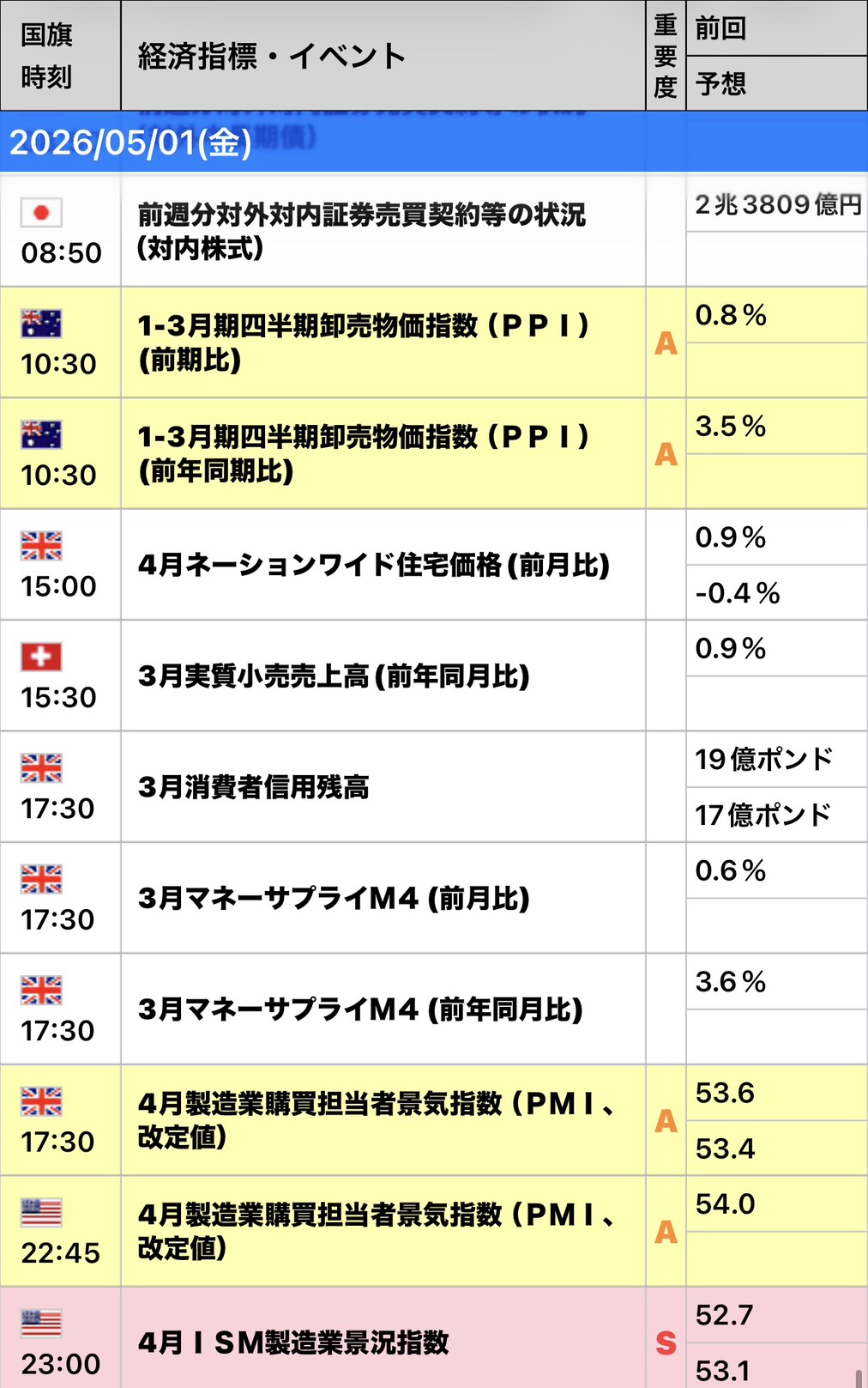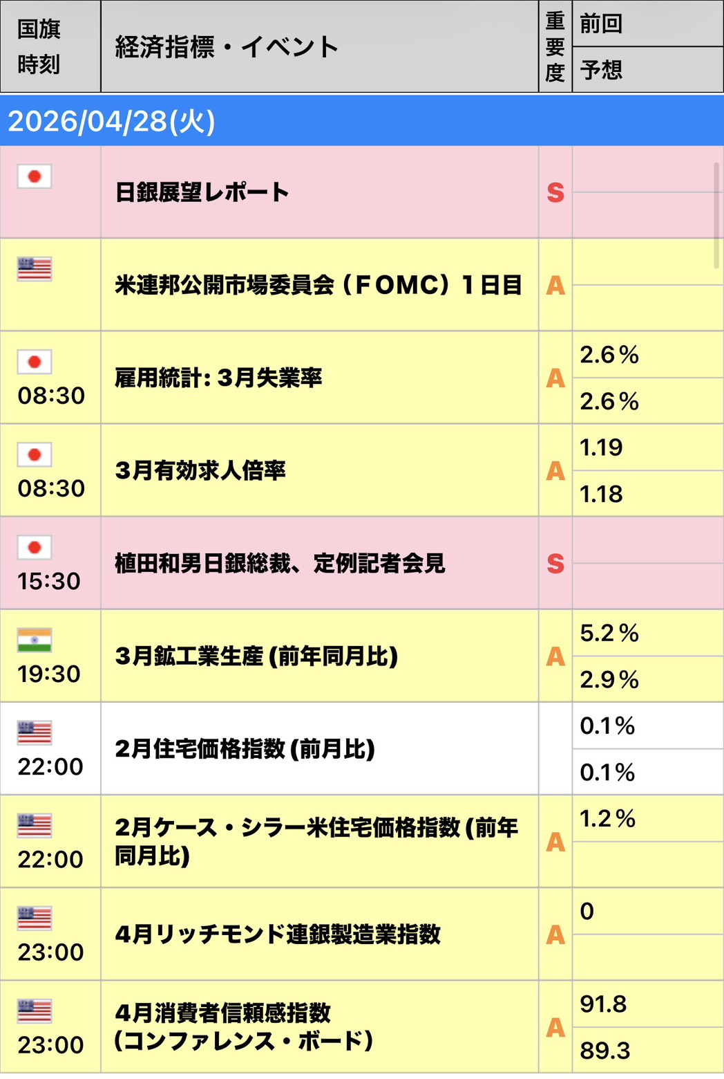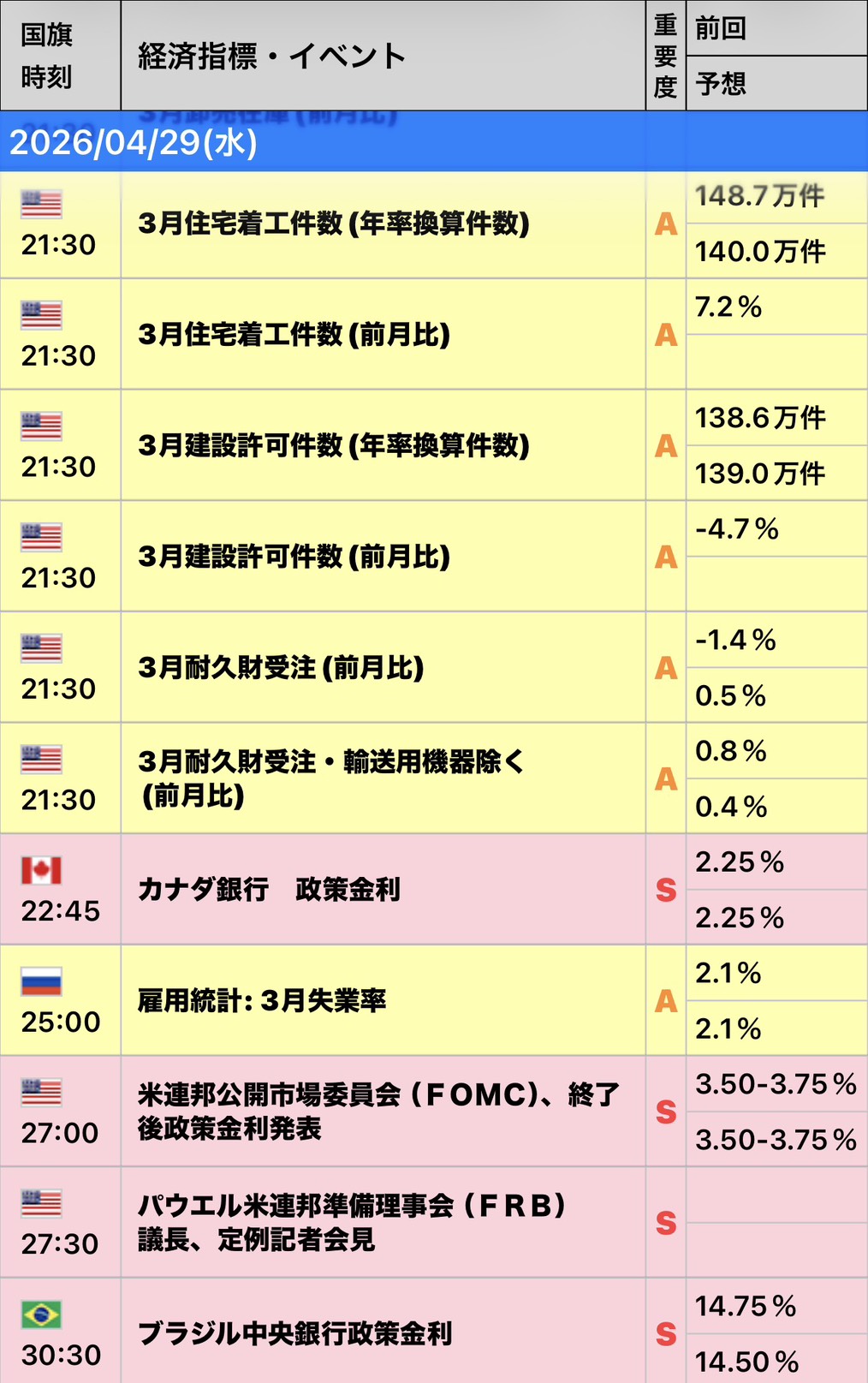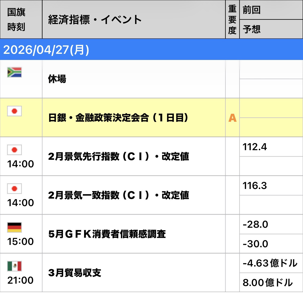 | 時間 (JST) | 指標名・重要度 |